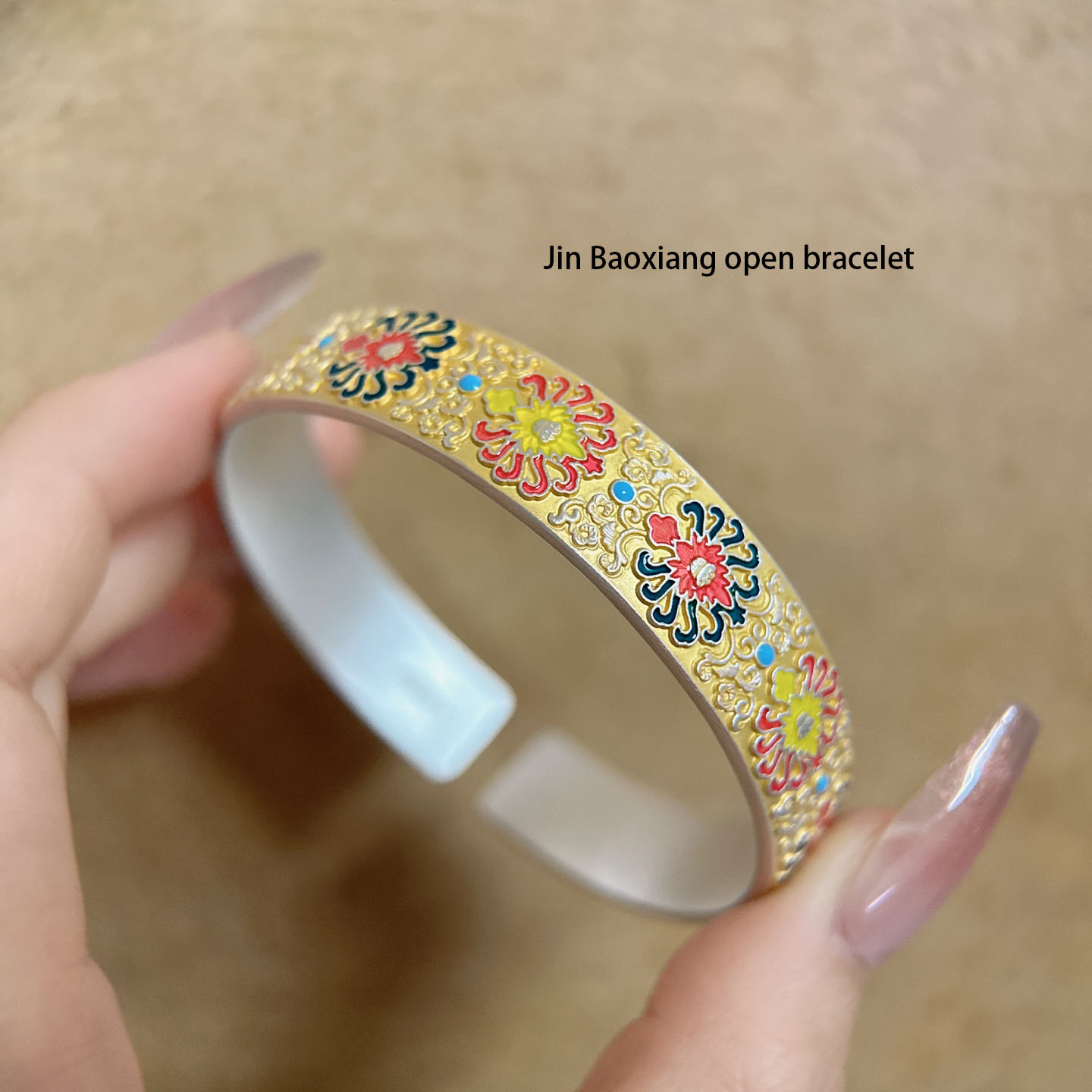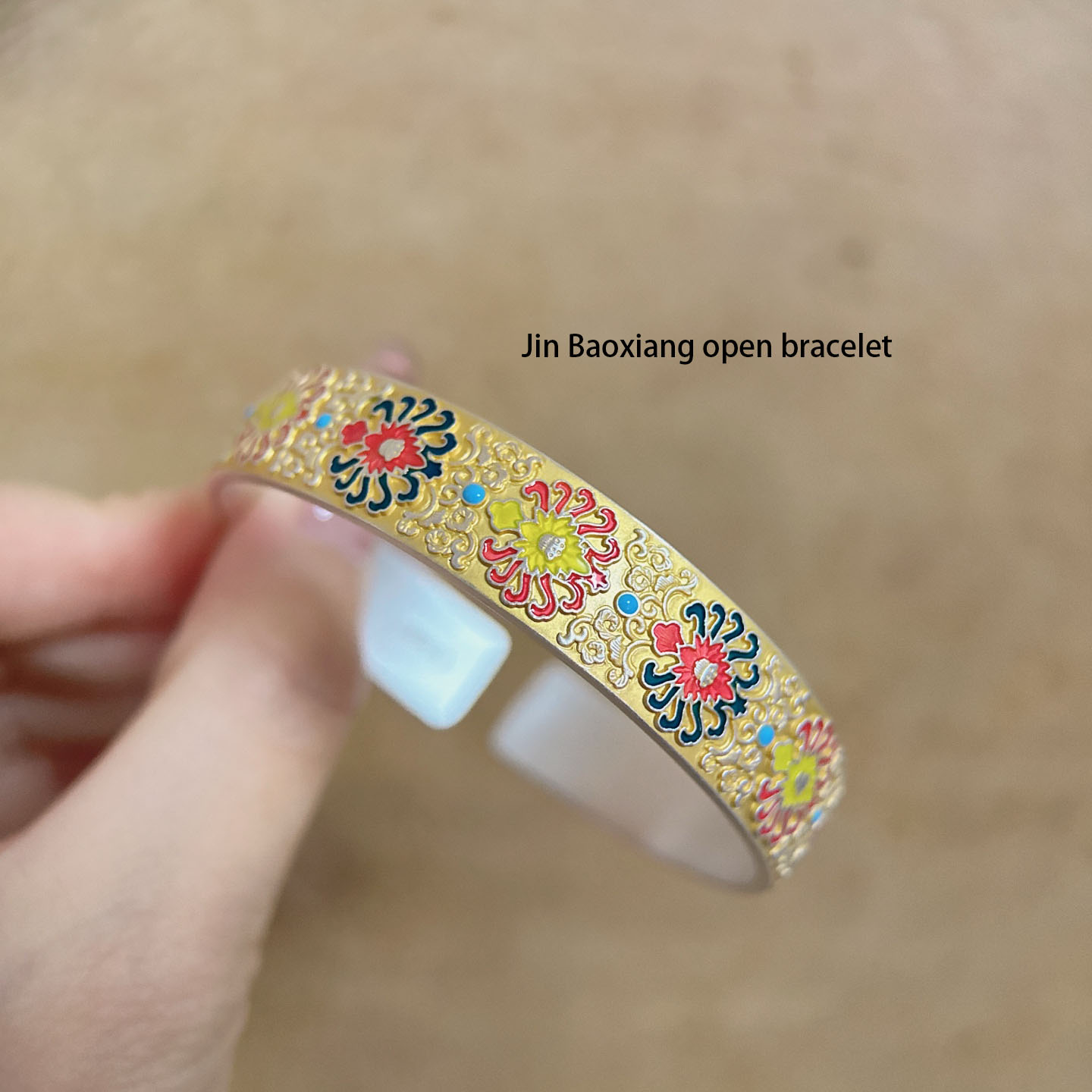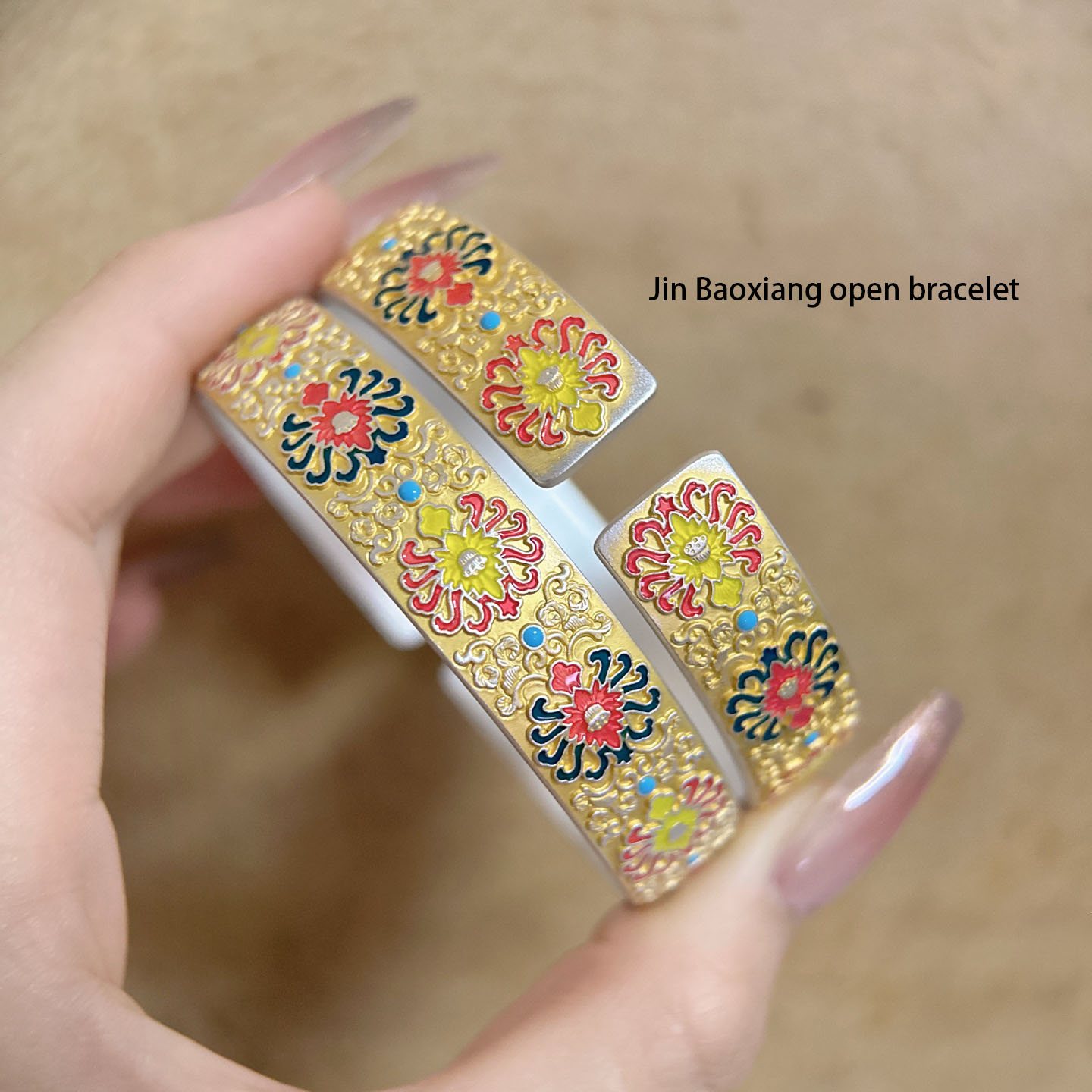 金宝祥珐琅开口手镯是传统工艺与艺术美学的完美融合。这款手镯采用宫廷珐琅工艺,经过多重工序,在贵金属基底上呈现出浓郁的红、蓝、黄三色。花卉图案栩栩如生,每一朵都经过手工精心雕琢,线条细腻柔滑,与珐琅的鲜艳色彩相得益彰,散发出复古奢华的韵味。开口设计不仅佩戴方便,更可根据不同腕围进行微调。整体风格融合了明清宫廷珠宝的华贵与现代设计的优雅。无论搭配旗袍展现东方韵味,还是搭配时尚单品,打造混搭造型,它都能成为视觉焦点。它既是收藏佳品,也是一件腕间艺术品,彰显着佩戴者的文化品味与审美情趣。