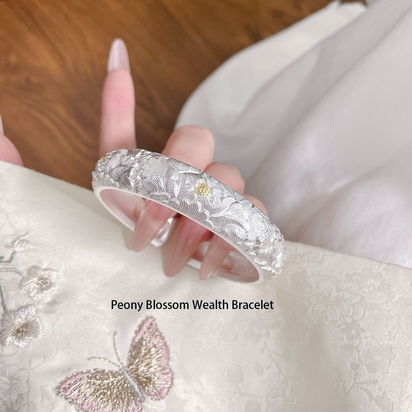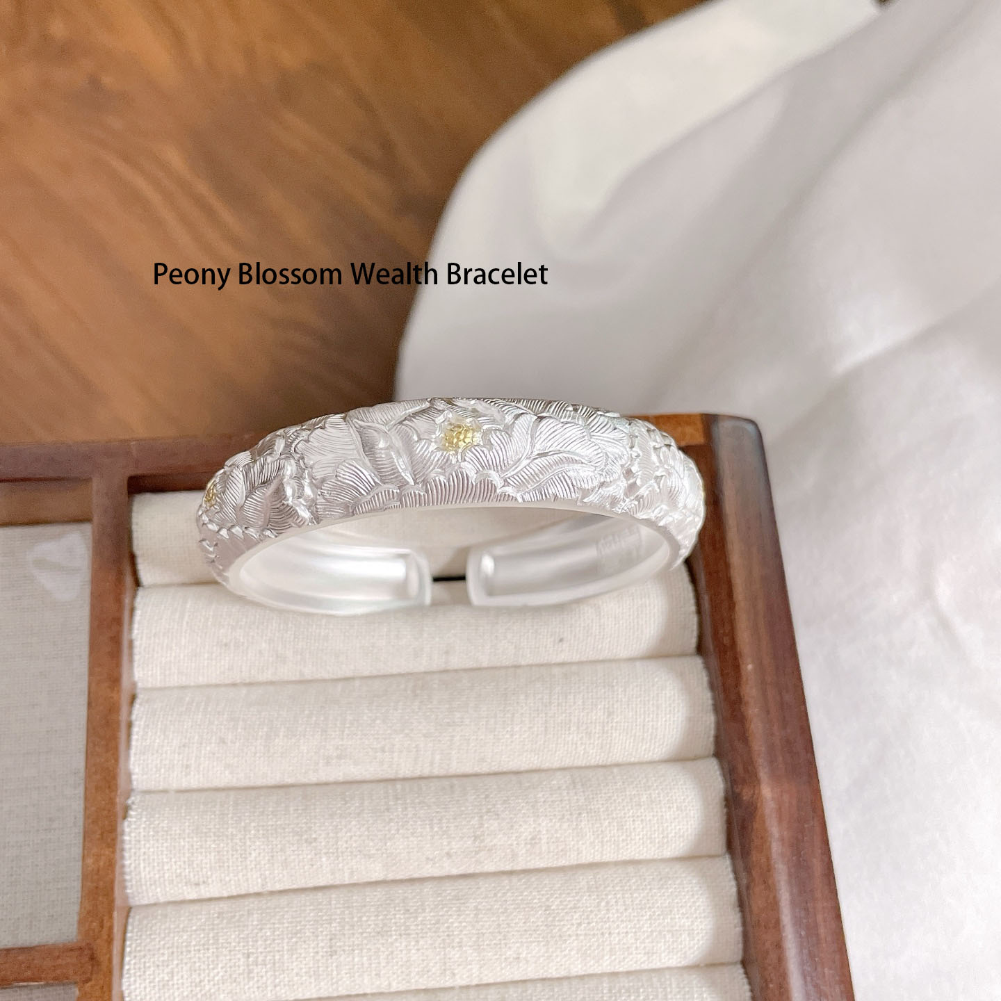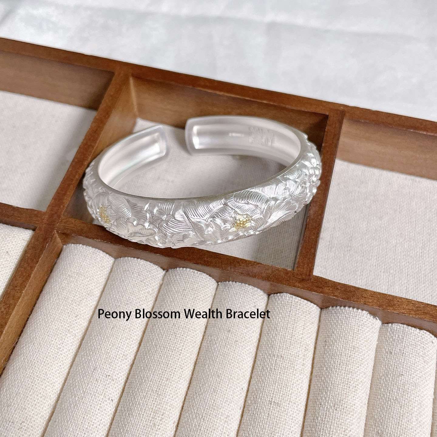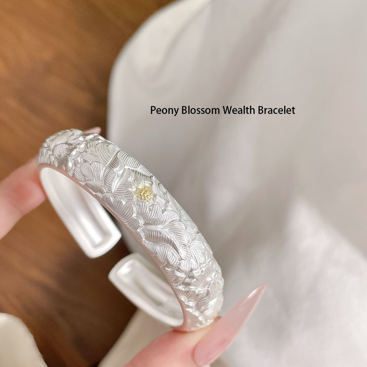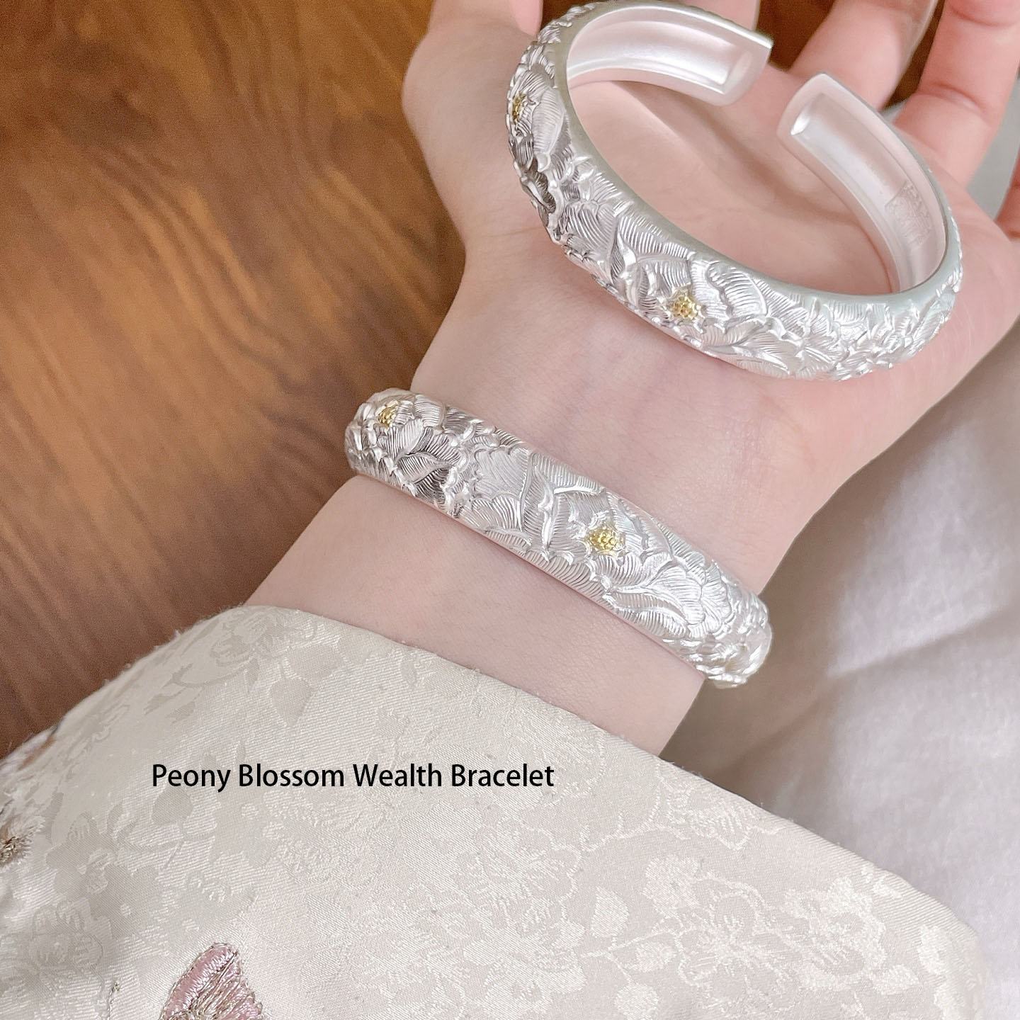 Embrace prosperity and elegance with our Peony Blossom Wealth Bracelet. Carved from premium silver and accented with subtle gold details, this cuff bracelet features exquisitely detailed peony blossoms—an emblem of wealth, honor, and prosperity in Chinese tradition. The matte silver finish gives it a refined, understated luxury, while the intricate floral engravings showcase exceptional craftsmanship. The open-cuff design allows for easy wear and adjustment, making it a versatile piece for both daily wear and special occasions. Let the noble peony bring a touch of opulence and cultural significance to your style, as this bracelet becomes a cherished symbol of beauty and abundance.