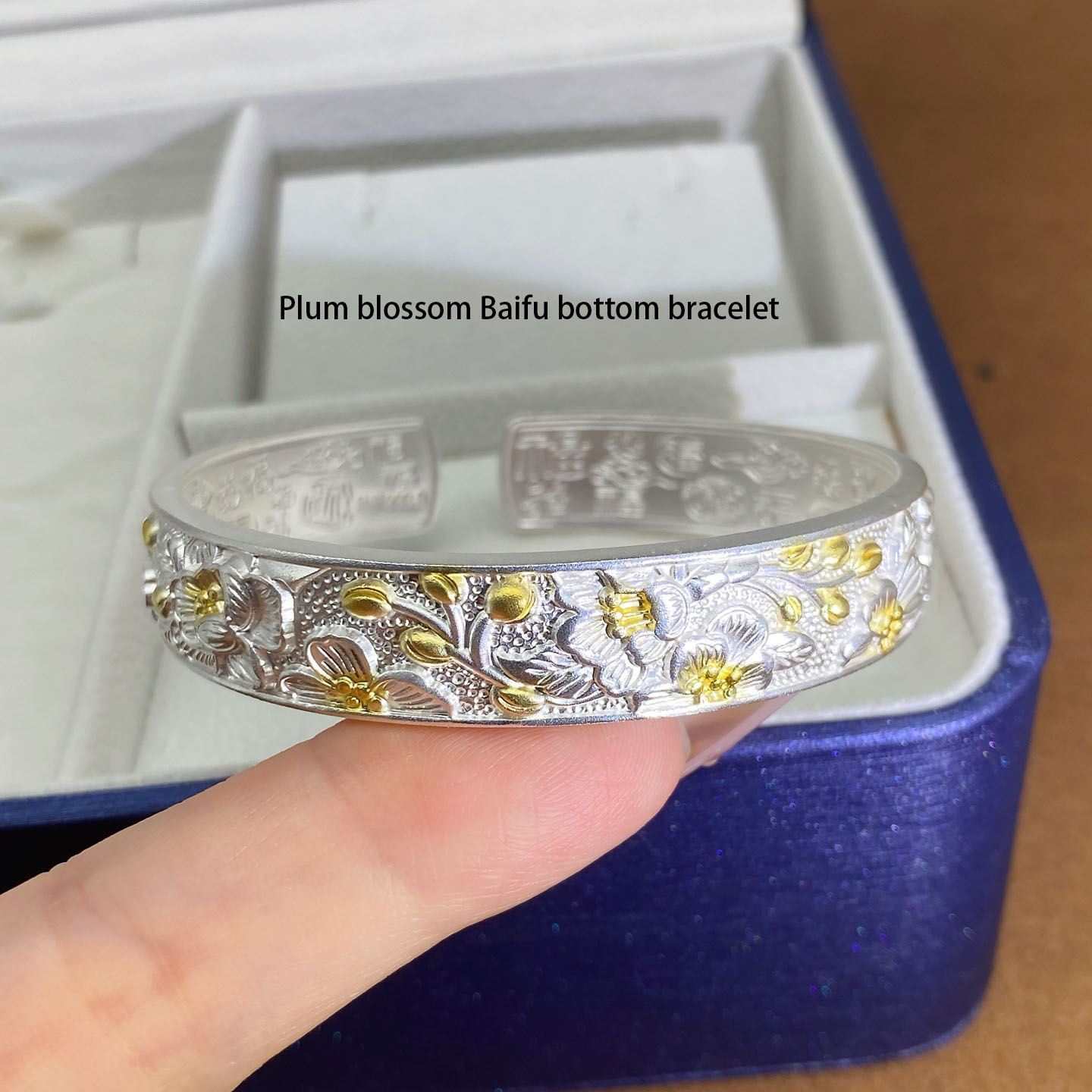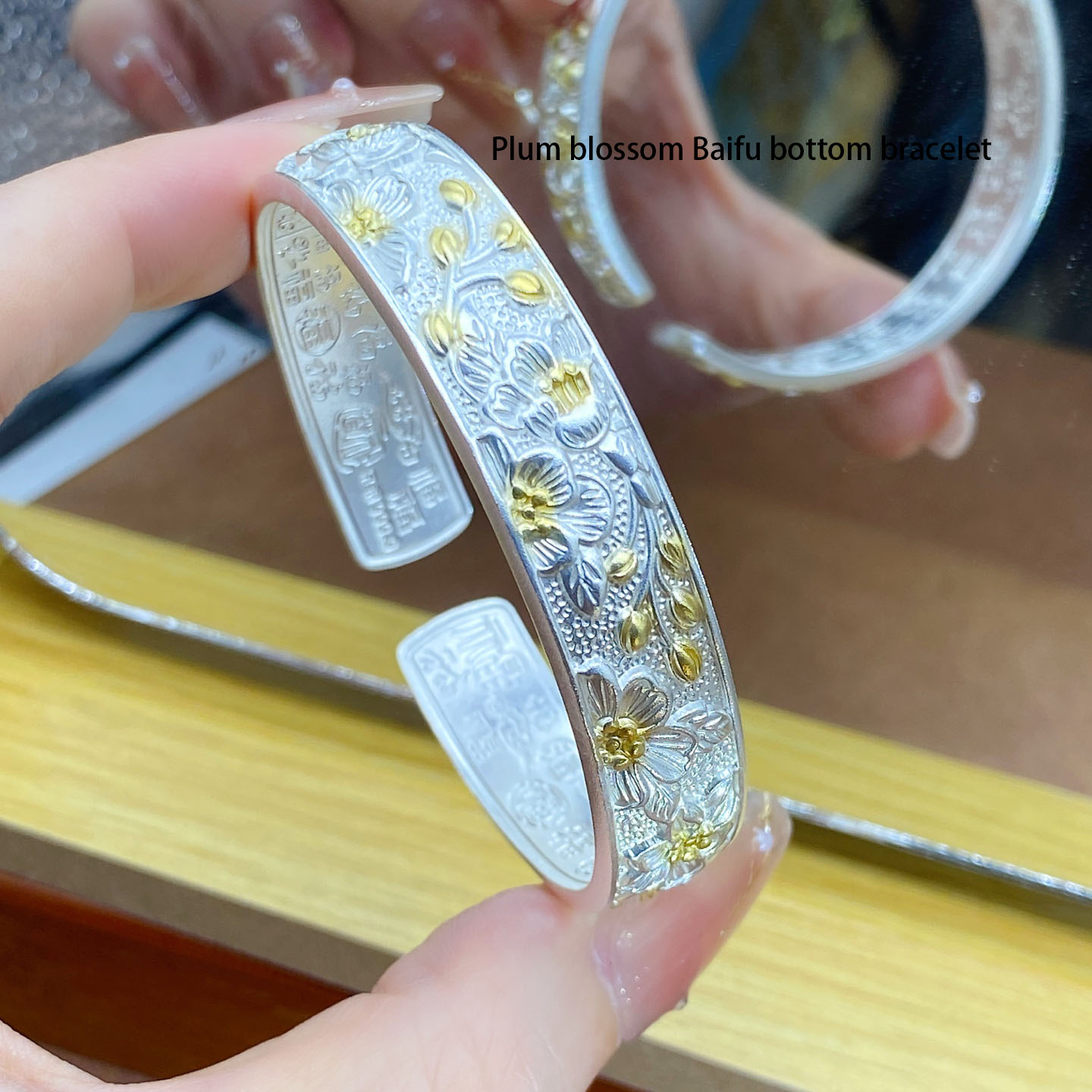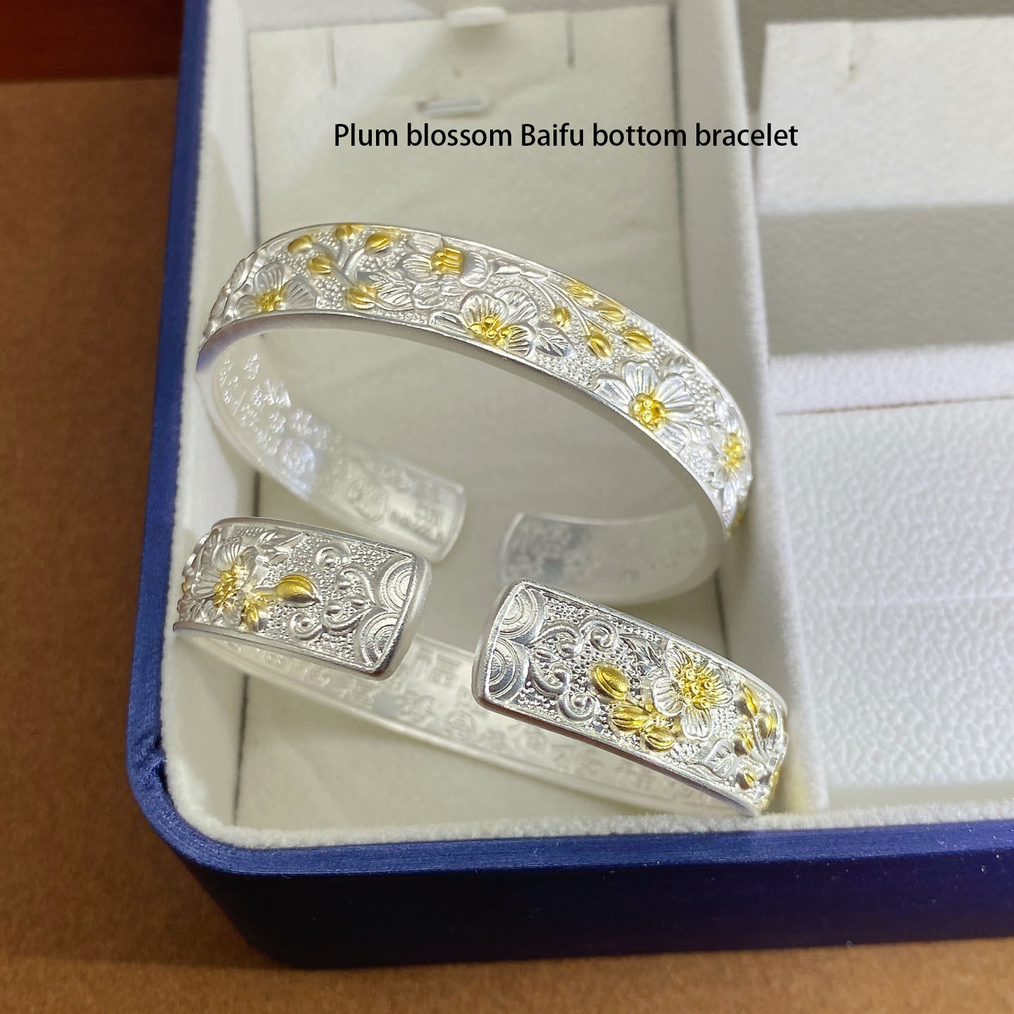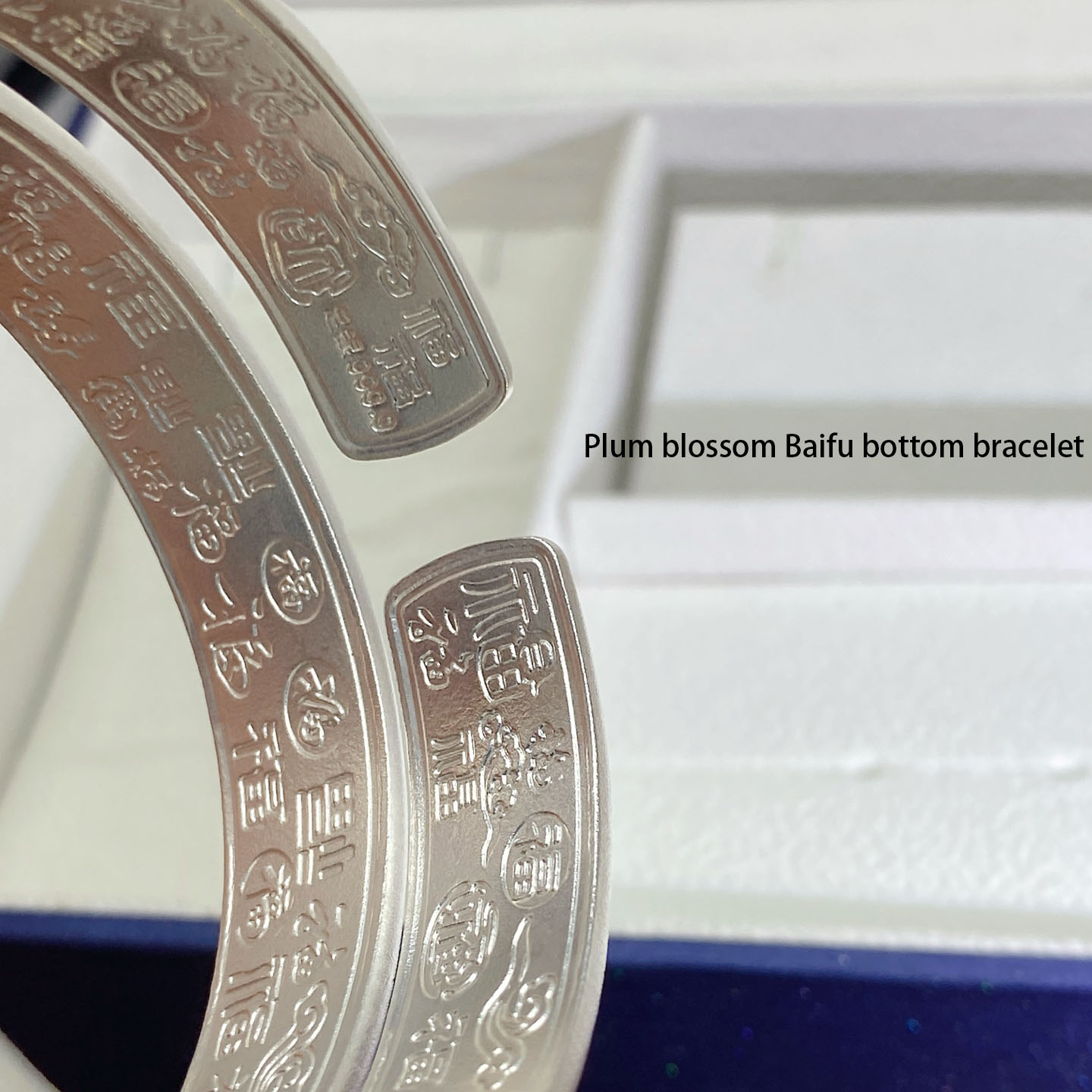 Delve into the rich tapestry of Chinese culture with the Plum Blossom Baifu Bottom Bracelet. Meticulously crafted, it showcases delicate plum blossom patterns—an emblem of resilience and aesthetic beauty in Chinese lore—adorned with golden touches for a hint of opulence. The inner side is engraved with “Baifu” (hundreds of blessings), a heartfelt wish for prosperity and good fortune. Forged from premium silver, it merges age-old craftsmanship with a design that transcends time. It’s an ideal choice for those who seek jewelry with cultural depth and artistic refinement, be it for daily wear or as a meaningful gift, carrying the charm of ancient art and sincere blessings.